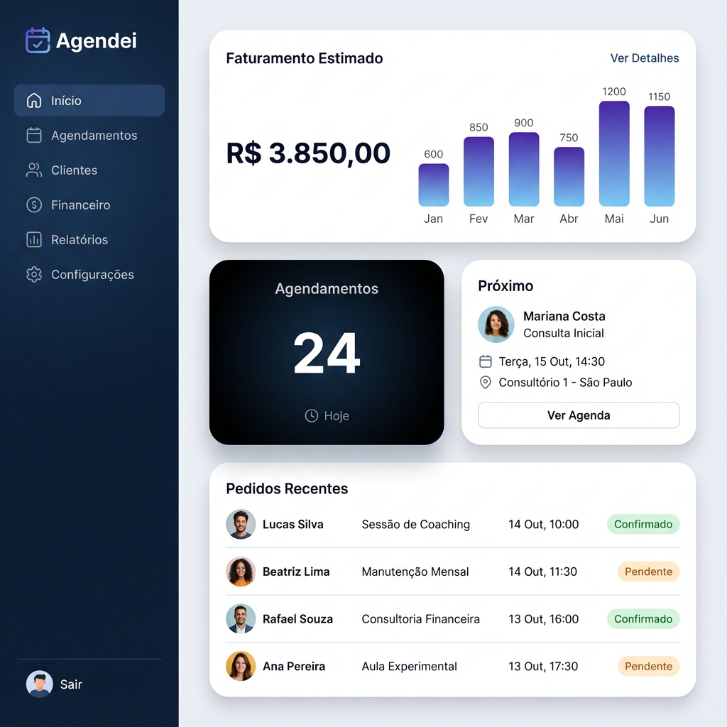 Dashboard financeiro, controle de comissões, gestão de equipe e histórico de clientes em um só lugar.
